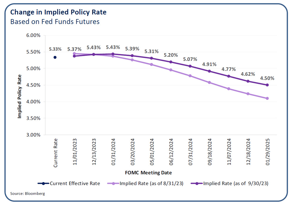 Recent weakness in both the equity and fixed income markets likely represents a resetting of expectations regarding future interest rates. While inflation has cooled from peak levels seen in June 2022, inflation expectations have once again begun to shift upward as oil prices have moved notably higher and wage growth has remained sticky. The Fed’s latest summary of economic projections reported higher than expected growth and inflation targets and a reduction in the number of interest rate cuts expected in 2024, which has exerted upward pressure on longer-term rates as investors digest a potential new normal.
